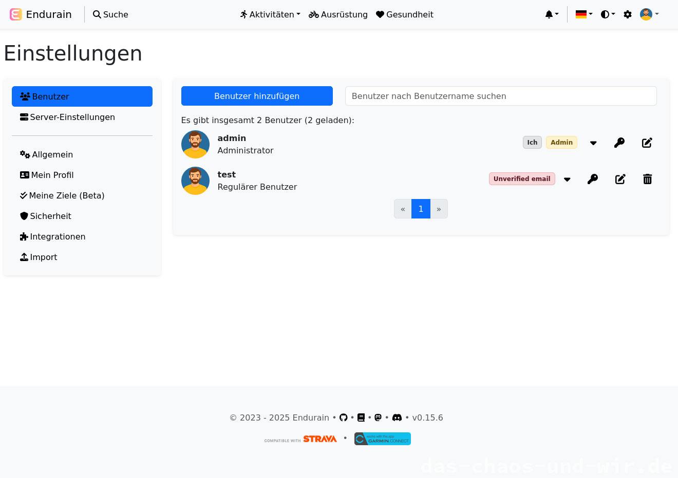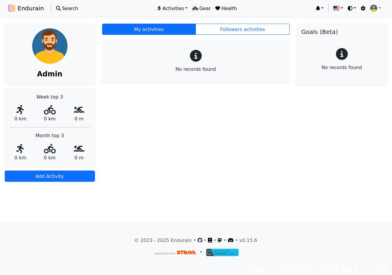 cd /opt/endurain sudo docker compose up -d - Initial steht nur das Admin-Konto zur Verfügung. An diesem ist eine Anmeldung mit dem Benutzername "admin" und dem Passwort "admin" möglich. Das Passwort sollte am Besten direkt geändert werden.