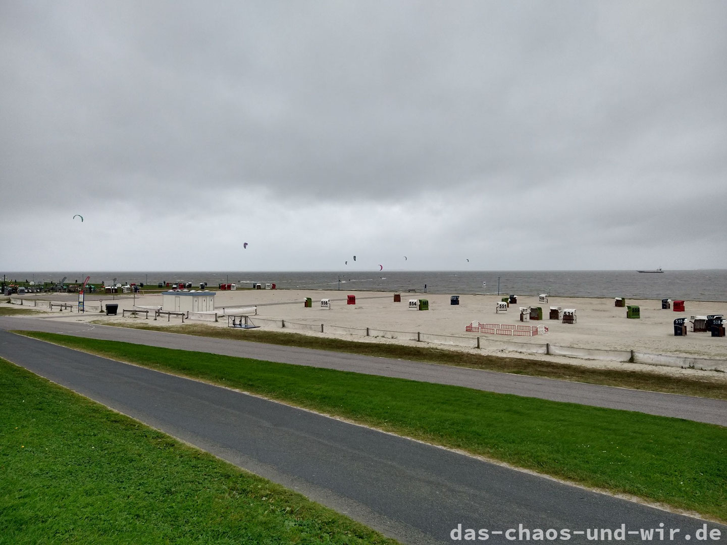 Die Freude auf dem Wasserspielplatz war jedoch nicht von langer Dauer, da nicht nur das Wasser von unten, sondern auch von oben mehr wurde. Treffender gesagt wurde es eher von der Seite mehr, denn der Wind blies relativ stark und konstant aus einer Richtung. Wir eilten zurück in Richtung Hafen und rannten von Strandkorb zu Strandkorb und suchten im Windschatten etwas Schutz vor dem Regen.